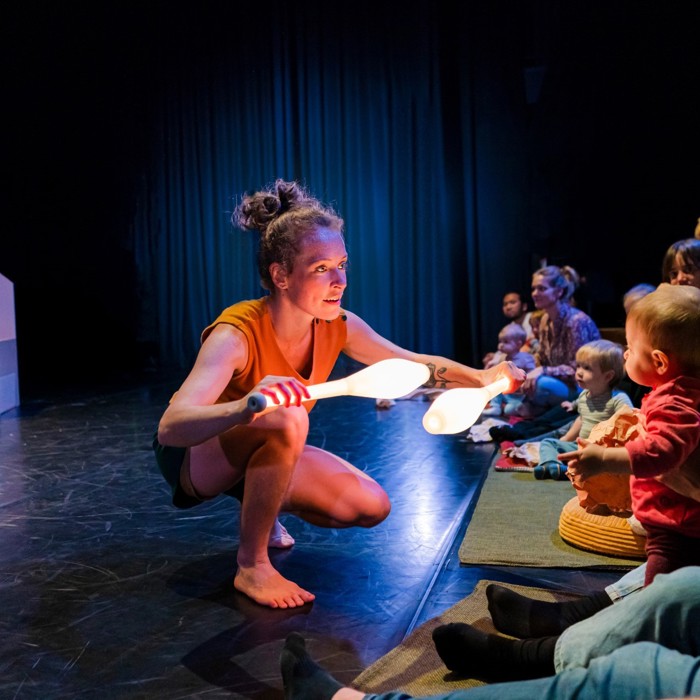 Be Kind is an intimate theater experience for babies aged 6 to 18 months and their parents/guardians. The little ones are introduced to acrobatics and juggling up close. In this flowing performance of sound, color and movement, two circus artists take you on a sensory journey.