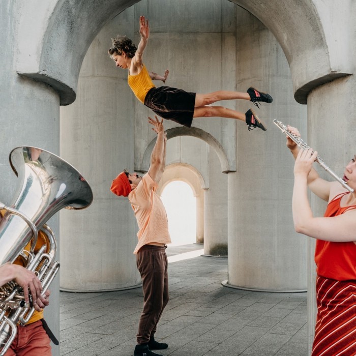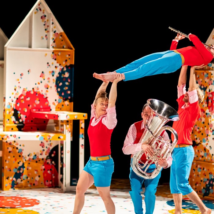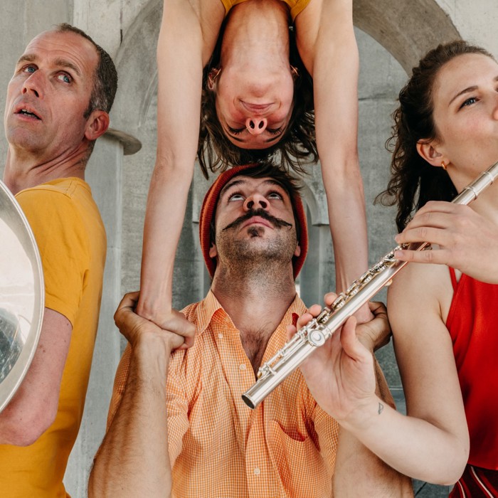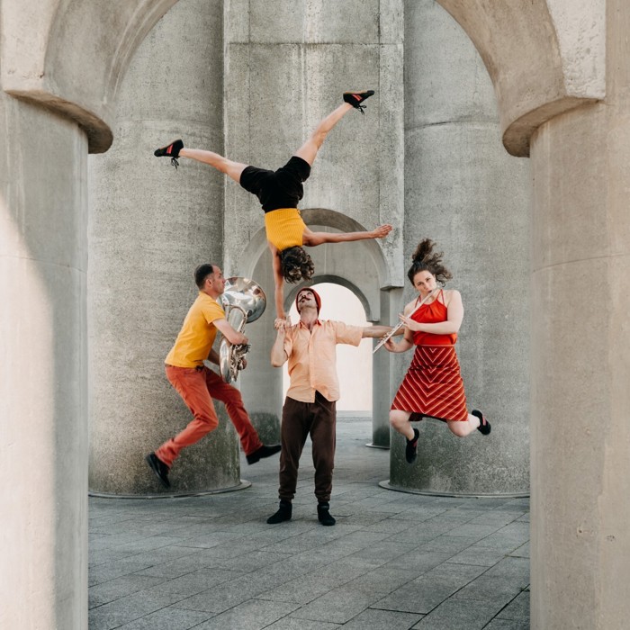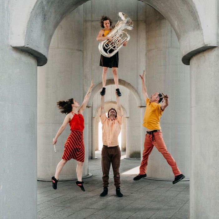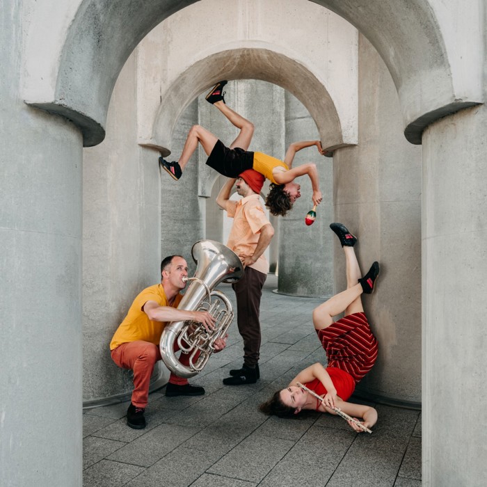 Marieke Franssen (dwarsfuit en piccolo), Joost van Genugten (tuba), Ivar van Woenzel (acrodance) en Sanne Hamstra (hand-to-hand)