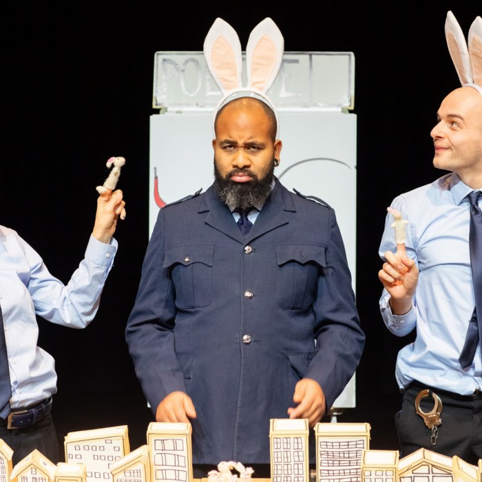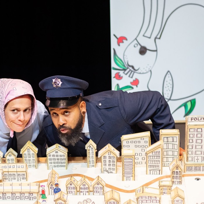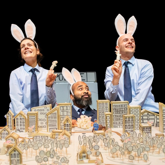 In Wanted: Rabbit three police officers go looking for a bunny who has broken out of jail. Rabbits, as you may have noticed, do not play by the rules. They dig holes without applying for a permit, eat carrots that they haven’t paid for, leave droppings in the street, and, in spite of their big ears, never listen. A police hunt for the bunny ensues, and the fugitive starts popping up as a finger puppet in every corner of the miniature city. It eventually becomes apparent that the city has been taken over by rabbits. Even the police chief starts to grow rabbit ears! Will you help us to solve this case?