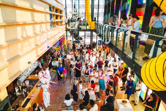 Je komt het Maaspodium binnen in de foyer: het M Café. Met het kleurrijke raamkunstwerk, interieur en de ruime hoeveelheid daglicht heeft het café een warme en lichte uitstraling. Het hoge plafond met rondlopend balkon geeft daarnaast een optimaal gevoel van ruimte. Bij mooi weer gooien we de deuren naar terras en grasveld open, waardoor je midden in de stad een uniek buitengevoel ervaart. M Café bestaat uit twee verdiepingen en biedt plaats voor ca. 250 personen, maar met 20 personen is het er ook al gezellig.