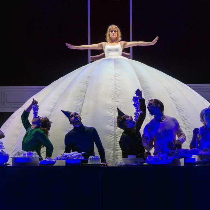 De uitbundige vormgeving, het geestige spel en de absurde dialogen zijn zo overrompelend dat je anders gaat kijken (…). Een toneelbeeld om je vingers bij af te likken.