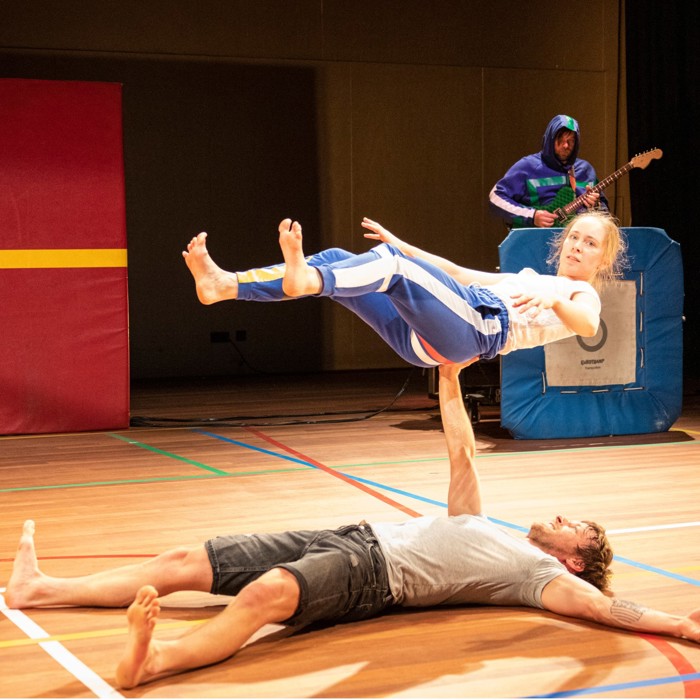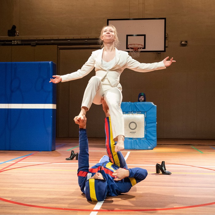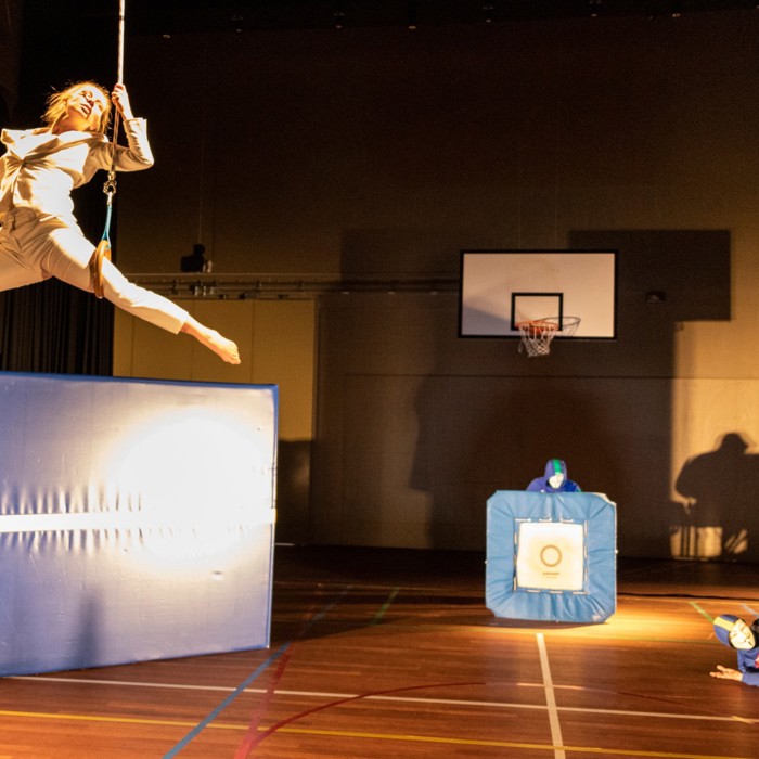 een oogstrelende voorstelling (...) waarin spel, acrobatische toeren, bewegende objecten en live muziek een prachtige eenheid vormen