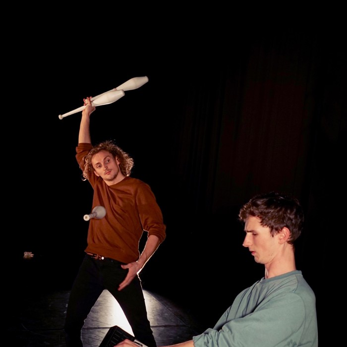 Het jongleerduo Tobi en Finn is in 2021 afgestudeerd aan Codarts. In Syncopate deconstrueren ze het ambacht dat ze al zes jaar samen beoefenen. Ze laten zich inspireren door muzikale concepten om de vele factoren en details te onderzoeken die jongleren mogelijk maken. Syncopate is een uitnodiging om kennis te maken met Tobi en Finn’s geheel eigen begrip van het manipuleren van objecten, sound en lichaam.