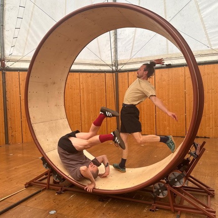 Met The Idle Hour werkt Samuel samen met William Blenkin. Deze poëtische en fysieke voorstelling onderzoekt de voortdurende drang naar productiviteit in onze hedendaagse samenleving. Twee acrobaten delen het toneel met een mensgroot hamsterrad: het object fungeert zowel als decorstuk én als metafoor. Waar de ene figuur rust uitstraalt en verstilling zoekt, wordt de ander voortgedreven door onrust en ambitie. Hun botsende energieën en fysieke interacties creëren een indringend beeld van het innerlijke conflict dat velen herkennen: de strijd tussen de drang om te presteren en het verlangen om gewoon te zijn. Zonder woorden, maar met een krachtig samenspel van acrobatiek, dans en geluid, roept The Idle Hour vragen op over de ratrace waarin we leven, de waarde van stilstand, en het vinden van betekenis in een wereld die nooit pauzeert.