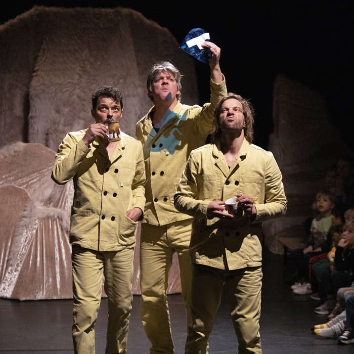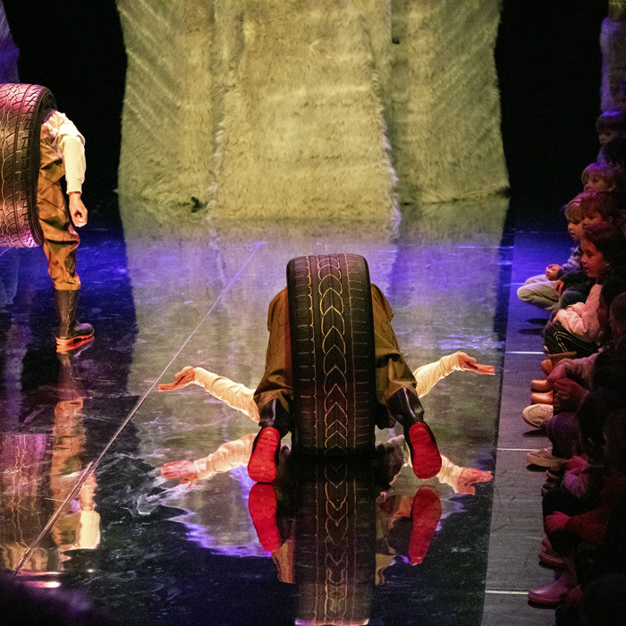 Deze voorstelling speelt zich af op een lange mat, met aan weerszijden drie rijen bankjes waarop het publiek plaatsneemt. Op die manier zitten kinderen en ouders dicht op de voorstelling, maar geen zorgen: iedereen zit achter een stevig koordje want we verwachten De Grote Vijf op het toneel…