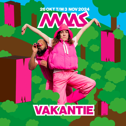Van 26 oktober t/m 3 november 2024 kan je weer kunst kijken & kunst maken als MAAS Creator tijdens de Maasvakantie. Er worden prachtige voorstellingen gespeeld en kunstenaar NéNé (Naomi Streefkerk) maakt van de foyer haar atelier. Ze werkt daar aan een reusachtig bewegend kunstwerk. Alle kinderen in Rotterdam en iedereen die zich kind voelt is welkom om mee te bouwen in het atelier van NÉNÉ.