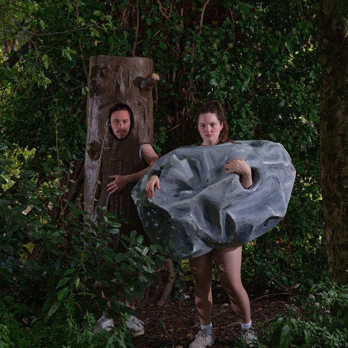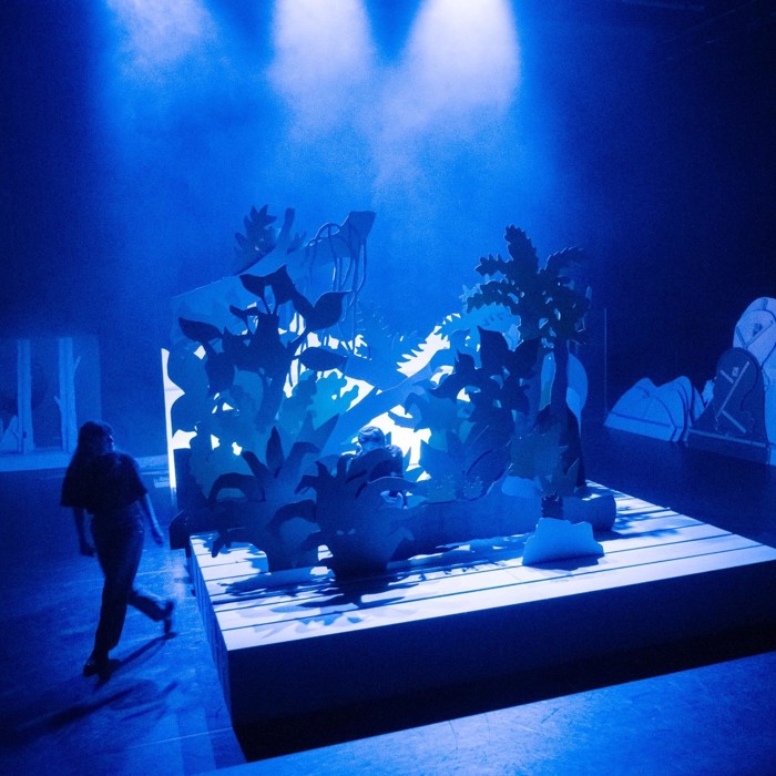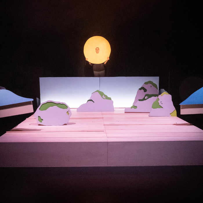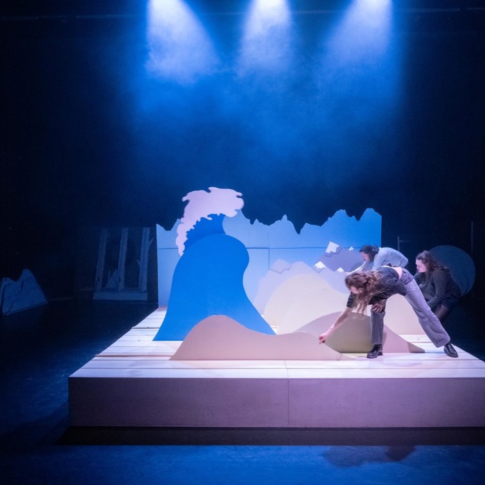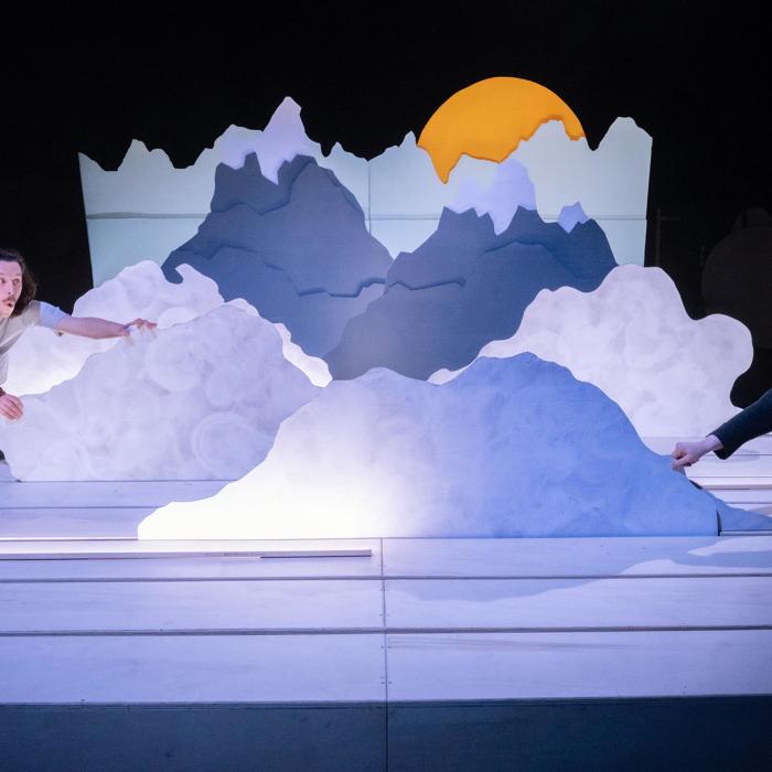 Dit is het monumentale verhaal van hoe onze aarde voortdurend in beweging is, verteld door een enorm decor van kartonnen rivieren, wolken en bomen. In Er rent een berg voorbij kruipen wouden over het podium, verkruimelen bergen tot stranden en danst de maan een walsje met de zee, terwijl een vierstemmig koor het geluid laat klinken van krakende rotsen en tsjilpende vogels. Laat je meevoeren door een immens tot leven gekomen landschapsschilderij dat je laat denken op een andere tijdschaal. Van de geboorte van de maan, langs de eerste alg die aan land komt, tot het uitsterven van de mens en zelfs verder…