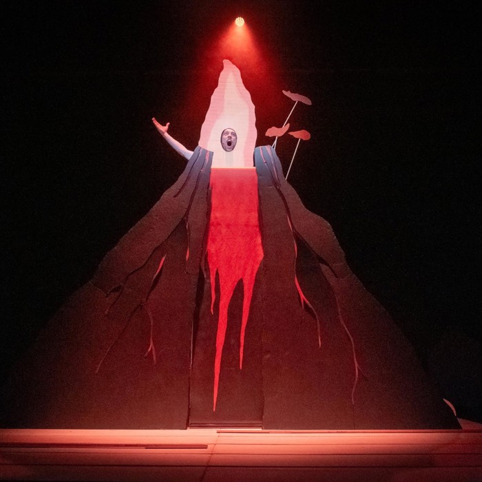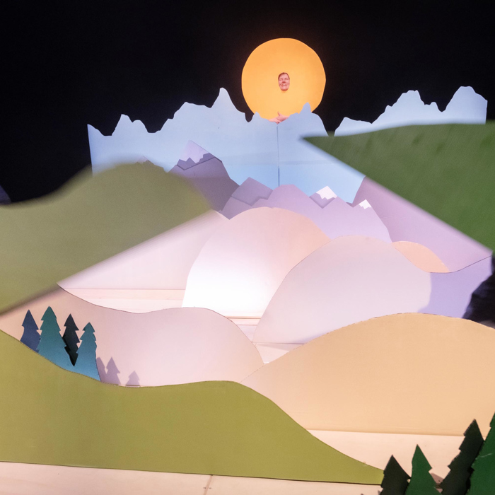 Er rent een berg voorbij vertelt het eeuwenoude verhaal van onze aarde zonder woorden, maar met een enorm decor van kartonnen rivieren, bossen en bergen. Van de maan die ontstaat tot het verdwijnen van de mens: een magische tijdreis voor iedereen vanaf 8 jaar.