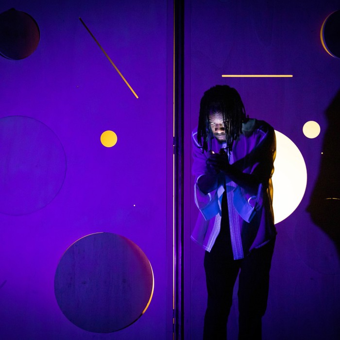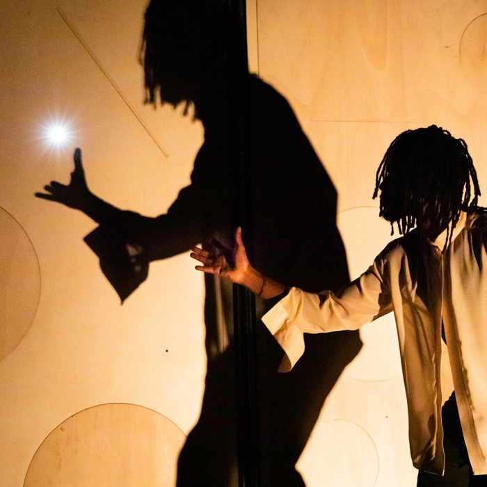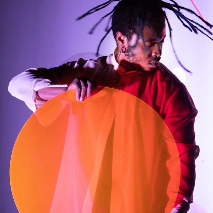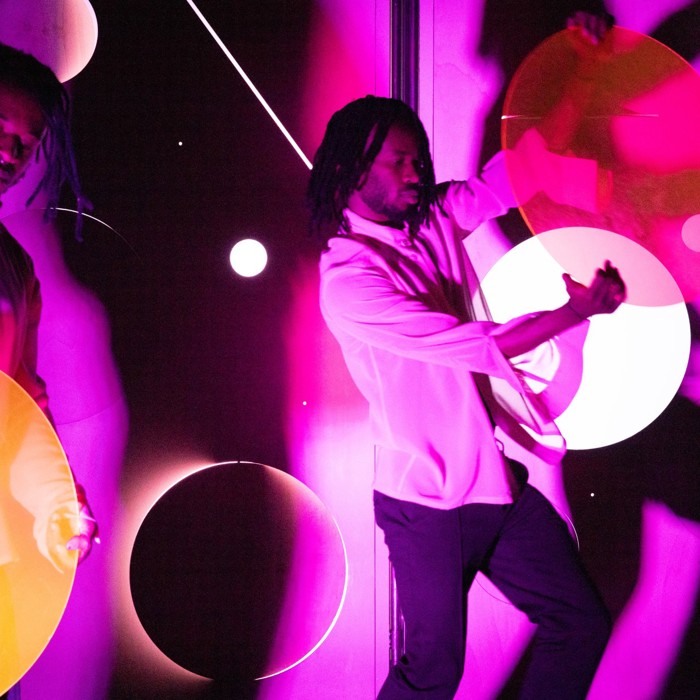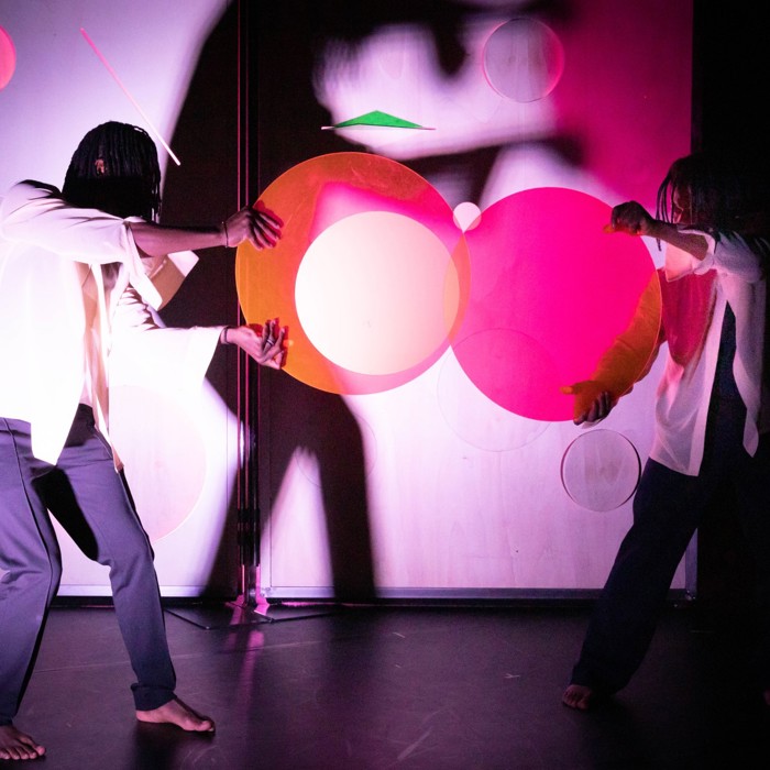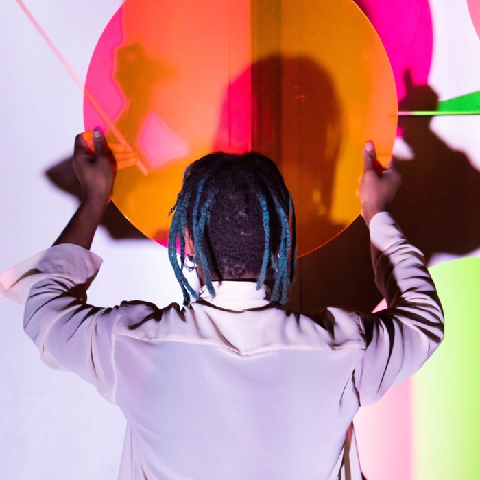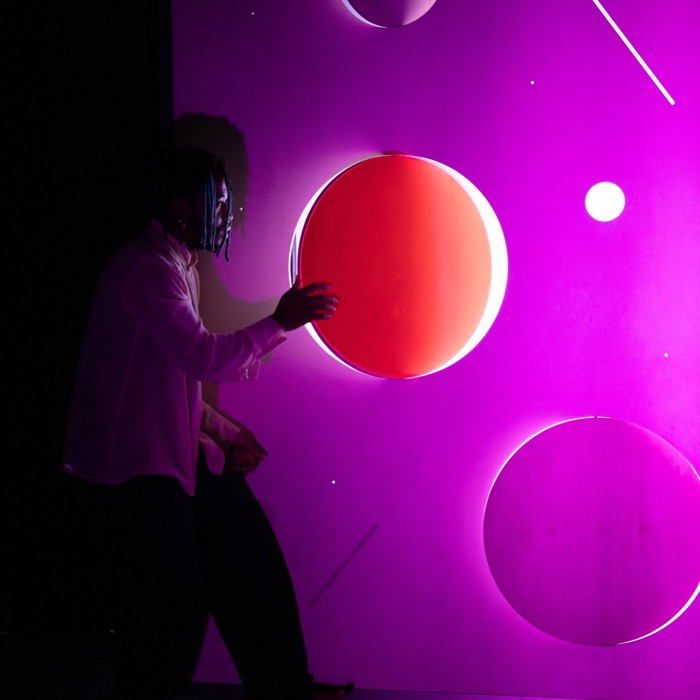 Op een reis van pikzwart naar fluoroze, langs gebroken hoeken, draaiende cirkels en slingerende figuren. En overal is er licht, soms nauwelijks zichtbaar, soms verb(l)indend.