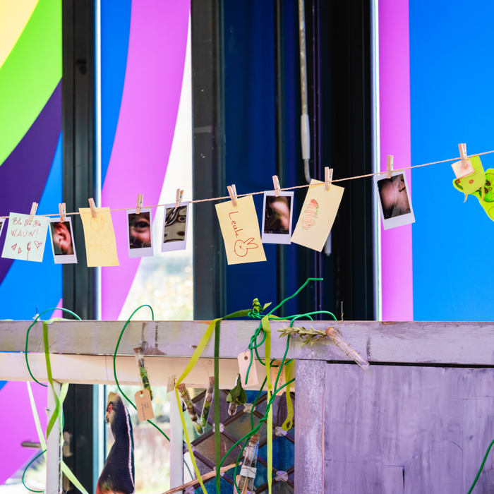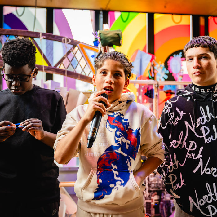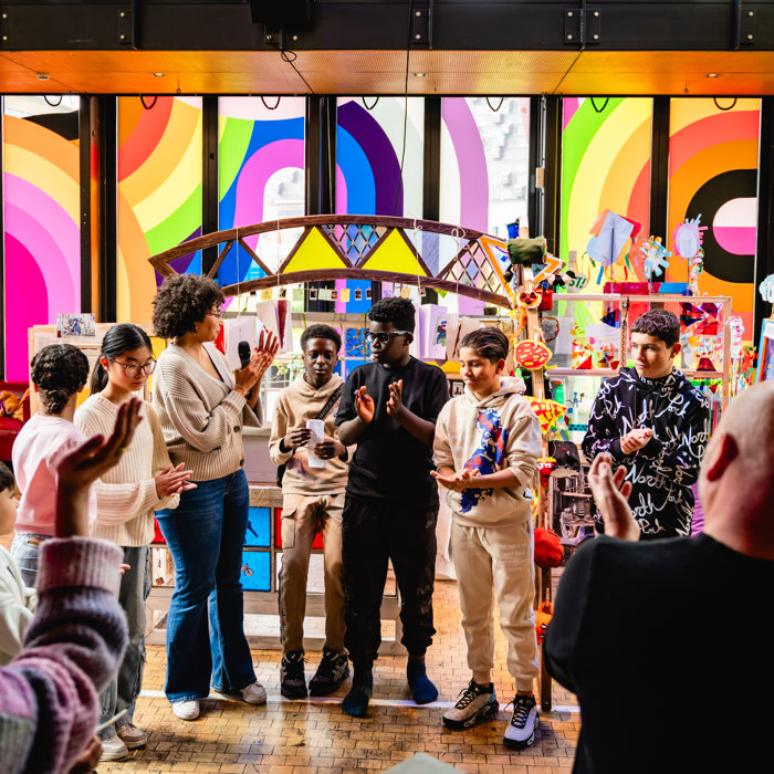 Geïnspireerd door het thema Binnenkant – Buitenkant gingen leerlingen van zes Rotterdamse scholen aan de slag met een bijzonder kunstproject. Elk paneel kreeg een unieke, persoonlijke invulling, passend bij de belevingswereld van de leerlingen. Op basisschool Müllerpier trokken de leerlingen de natuur in voor een echte natuurexpeditie, waarbij ze hun indrukken verwerkten in het paneel. De kinderen van KC De Vlinder werkten samen met een videograaf om hun binnen- en buitenwereld in bewegend beeld te vangen. Op Kasteel Spangen kwamen kleurrijke verhalen uit de wijk tot leven, terwijl op De Korf Montessori fashion en spoken word de hoofdrol speelden. De leerlingen van OBS Delfshaven gaven een intieme kijk in hun eigen wereld door zelfportretten te maken. De Van Oldenbarneveltschool dook in het thema thuis en bracht een warme, huiselijke sfeer tot leven met zelfgemaakte knuffels en oude telefoons waarop persoonlijke boodschappen te beluisteren waren. Zo vertelt elk paneel een eigen verhaal - van binnen naar buiten, en van buiten naar binnen.