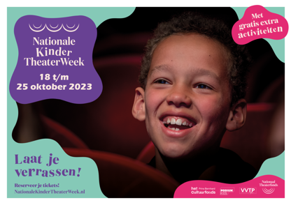 Van 18 tot 25 oktober 2023 vindt in ruim zestig theaters in Nederland de eerste Nationale KinderTheaterWeek plaats. Waar in deze week vaak al kinder- en jeugdvoorstellingen staan geprogrammeerd, staat dit keer het gehele theater in het teken van kinderen. Om te laten zien hoe leuk theater is! Voor en achter de schermen worden er diverse activiteiten, die vrij te bezoeken zijn, georganiseerd.