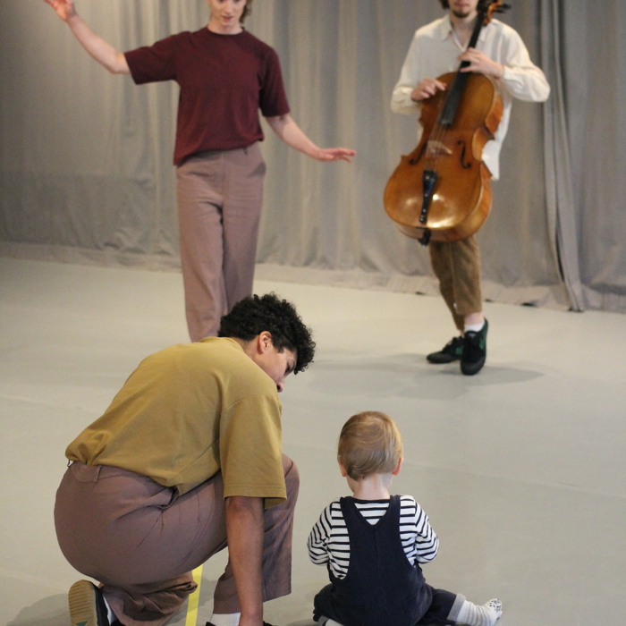 Een danser, een circusartiest en een cellist onderzoeken een ruimte vol lijnen en wielen, begeleid door de klanken van de cello. Het publiek wordt langzaam maar zeker steeds meer de speelvloer opgehaald. Peuters en ouders storten zich op rollen toneeltape, maken lijnen of peuteren ze los. Op karretjes rollen de kinderen voorbij.