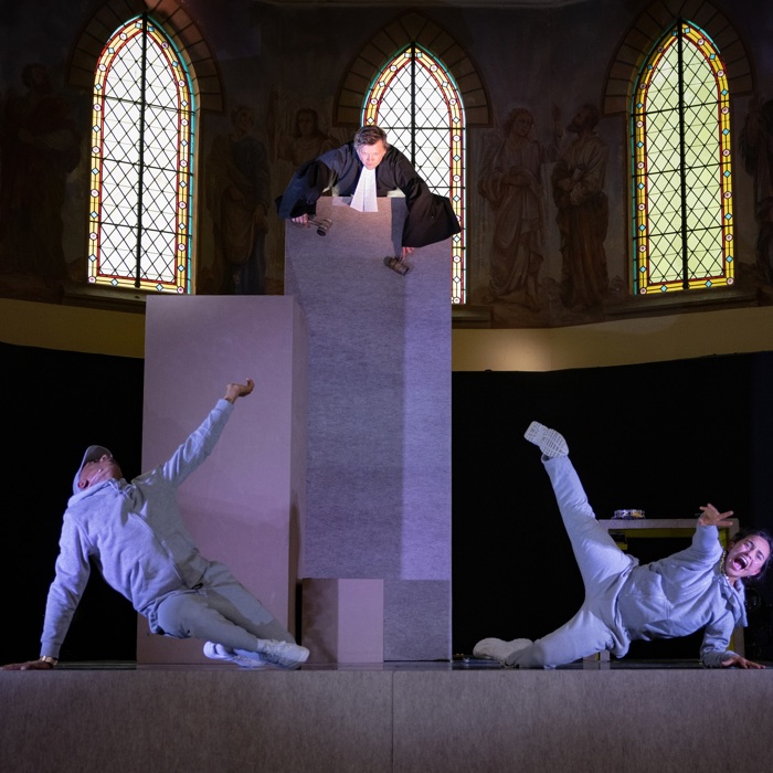 In een kerk bevindt zich een absurde rechtbank. Hier worstelen rechters, verdachten, slachtoffers en experts om hun menselijkheid te behouden. Rituelen en regels moeten orde scheppen in de chaos. Ondertussen ziet het publiek het onderscheid tussen de betrokkenen steeds verder vervagen.