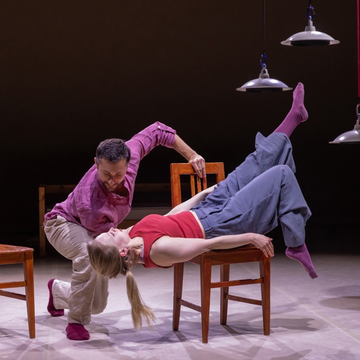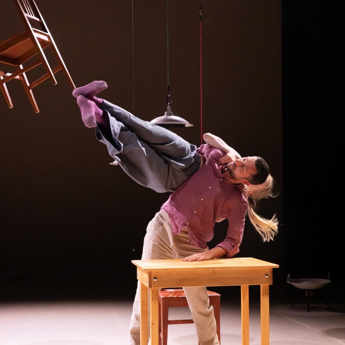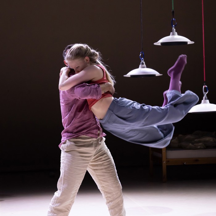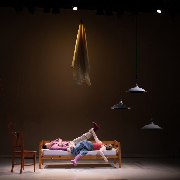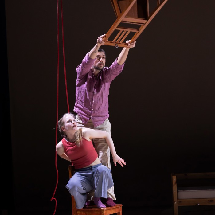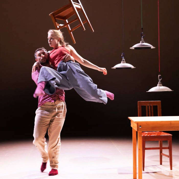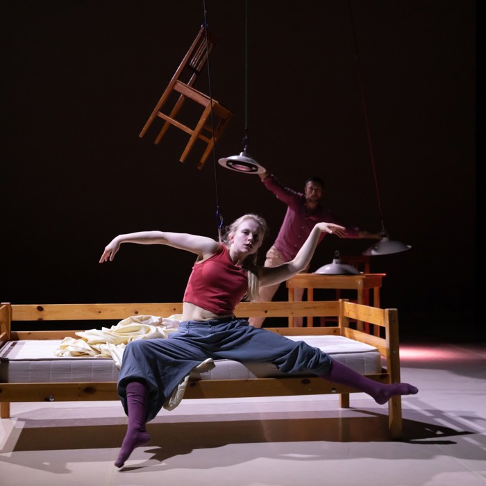 Twee dansers, twee stoelen, een tafel en een bed maken de huiselijke wereld compleet. Met een vleugje Louis Davids: ‘Je verbeeldt je dat je aan de touwtjes trekt, maar och, het leven smijt je heen en weer..’ Met op maat gemaakte muziek van Stevko Busch.