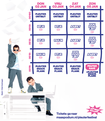 Opstaan, ontbijten, creche en naar bed... soms lijkt het leven van een peuter wel op dat van een volwassene vast in de grijze sleur. Daarom organiseert Maas, speciaal voor de allerkleinsten, dit jaar weer het PLEUTERFESTIVAL even ontsnappen uit het vaste ritme! Van 2 tot en met 5 januari gooien we de agenda’s overboord en is het tijd om de ‘peutersleur’ even helemaal los te laten en zelf helemaal los te gaan!