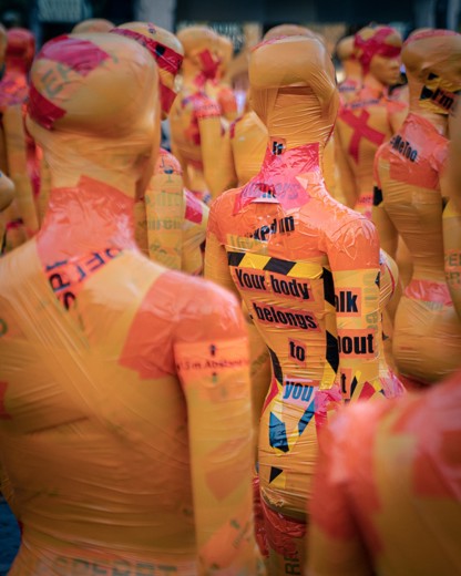 “Qua bewegingen heb ik mij laten inspireren door protestbewegingen: de vuist, de schreeuw, het marcheren van soldaten, Japanse precision walking (‘zo word je een goede conformist’), politieke speeches, maar ook arrestatiebewegingen en escalerend geweld.”