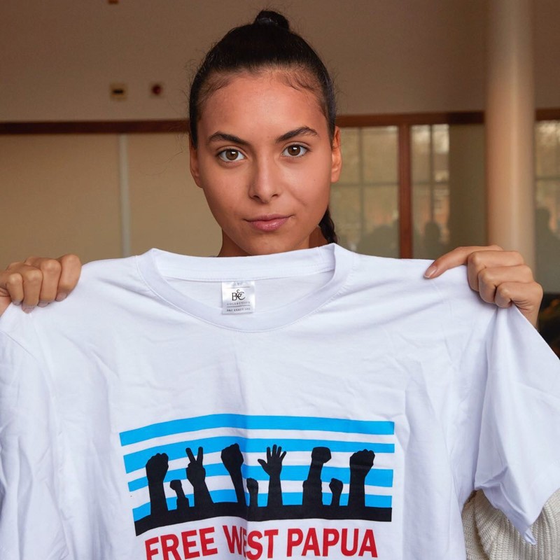 “De aanleiding voor mijn activisme is heel persoonlijk. Mijn roots liggen namelijk in West Papua. Dat is een voormalig Nederlandse kolonie die tegenwoordig illegaal wordt bezet door Indonesië. Ik woon zelf in Nederland omdat mijn opa en zijn onafhankelijkheidsidealen voor West Papua een te grote dreiging vormden voor Indonesië, waardoor hij als gevolg met zijn gezin moest vluchten uit zijn eigen land. Ondanks dat dit een heel specifiek onderwerp is, hebben de onderdrukkende structuren waaronder Papua’s leiden, raakvlak met andere protestbewegingen. Zoals Black Lives Matter, omdat Papua’s zich identificeren als zwarte mensen die niet bij Azië horen maar bij Melanesië. En bijvoorbeeld ook bij de klimaatbeweging omdat de gigantische rijkdom aan grondstoffen in West Papua wordt leeggeroofd vanwege economische belangen van multinationals. Papua’s maken daarnaast deel uit van de 5% inheemse volkeren wereldwijd die verantwoordelijk zijn voor het behoud van 80% van de biodiversiteit.