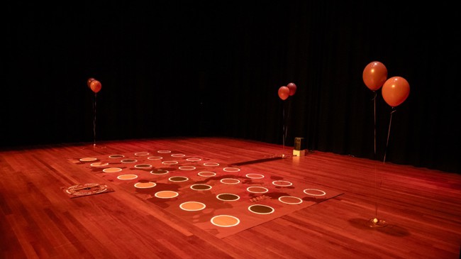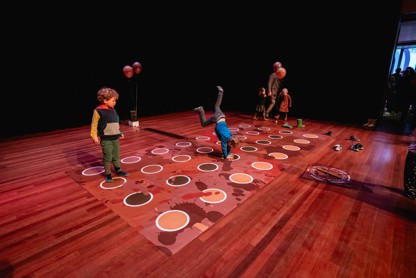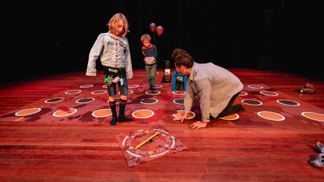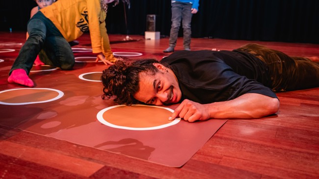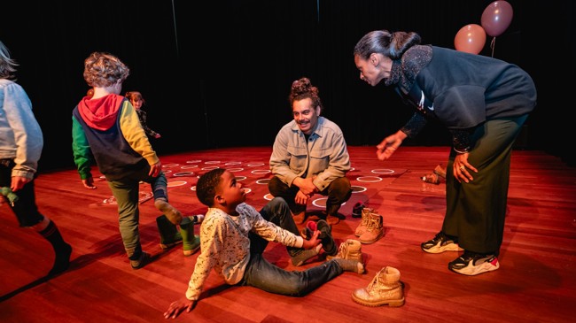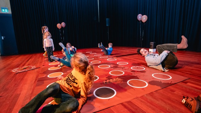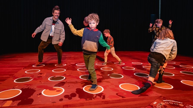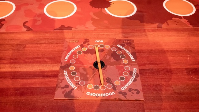 Om alvast in de kinderachtige vibes te komen, kun je voorafgaand aan de voorstelling een spelletje Shitty Twister komen spelen: een enorm Twisterspel in verschillende tinten bruin met onder elke stip een onverwachte verrassing.