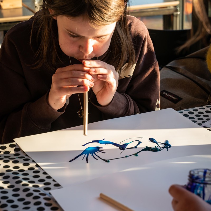 - Mythische wezens: Met fietspompen, föhns en andere huishoudelijke apparaten blazen de kinderen inkt over papier waarmee ze mythische wezens maken.