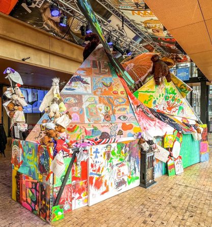 Afgelopen herfstvakantie 2022 zijn we in het Maaspodium al van start gegaan met een eerste installatie in de foyer. Beeldend kunstenaar Gerson Kronstad en theatermaker Peerke Malschaert bouwden gedurende 7 vakantiedagen samen met kinderen de Kamers waar alles kan, een kunstwerk “met muren van beesten en graffiti en een dak van tranen”. Kinderen konden dagelijks aanhaken om mee te werken aan het kunstwerk, maar ook voor of na een voorstelling in het Maaspodium kunstzinnig meewerken. Op zondag 30 oktober was de feestelijke onthulling van het eindresultaat.