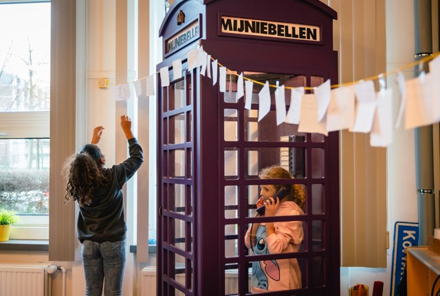 De telefooncel van stadsproject 010-MIJNIEBELLEN is te zien op verschillende Rotterdamse scholen. In de personeelskamer of midden op de gang en dat trekt een hoop bekijks. De kinderen kunnen even ontsnappen aan het rumoer in de klas. Een maskertje, een koekje en chillen op de kussens. In de telefooncel horen ze verhalen van stadsbewoners: volwassenen, schoolgenoten en kinderen van andere scholen. Hoe zorgen zij goed voor zichzelf? Hoe zorgen ze voor de stad en hoe zorgt de stad goed voor hen? Mo (8) vindt het spannend om in de telefooncel te stappen: 'Met een mobiele telefoon sta je in contact met de hele wereld, in zo'n telefooncel ben je juist helemaal afgesloten.'