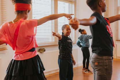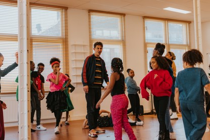 Hoe is het om één week een héle voorstelling te maken, met kinderen zonder ervaring? Juist heel leuk, blijkt uit de antwoorden van projectleider Esther en de deelnemers. Esther: “Ze kunnen supergoed bewegen, hebben humor, durven van alles. Het is een groep met onwijs veel lef. En soms staan ze opeens uit. Dat maakt het uitdagend, voor hun en voor ons. Ze leren hier ook om zich anders op te stellen. Hoe je geconcentreerd werkt, hoe je je focus houdt, hoe je samenwerkt met anderen. Ze krijgen een opeens professioneel team om zich heen en de voorstelling moet af, dus daar moet je samen hard aan werken. Ze leren dus ook wat daar allemaal bij komt kijken.”